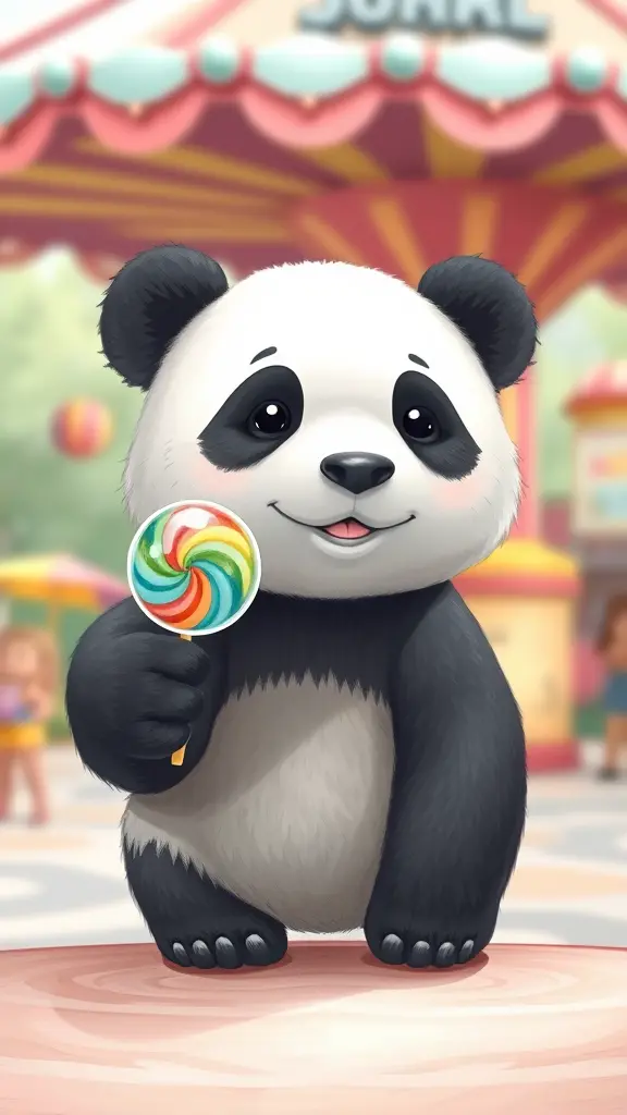 رسم.شبه الحقيقي  دب الباندا.في ملاهي العاب اطفال ماسك بيده  حلوى مصاص ابو عودي كرويه    مع خلفيه العاب ضبابيه كيوت