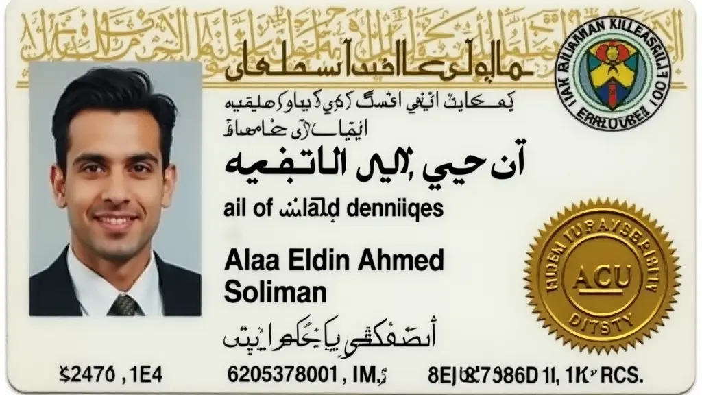 identity card of ACU university with name dr /Alaa Eldin Ahmed Soliman and has golden stamp its logo