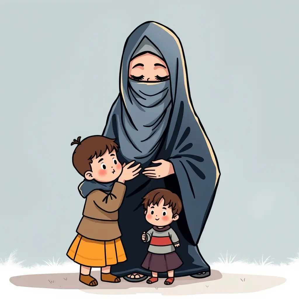 صمِّم لي صورةً أمًّا مُحجَّبَةً تُذاكِرُ لأطفالِها الثلاثة صورة كرتونية الأم والأطفال متقاربين في الحجم