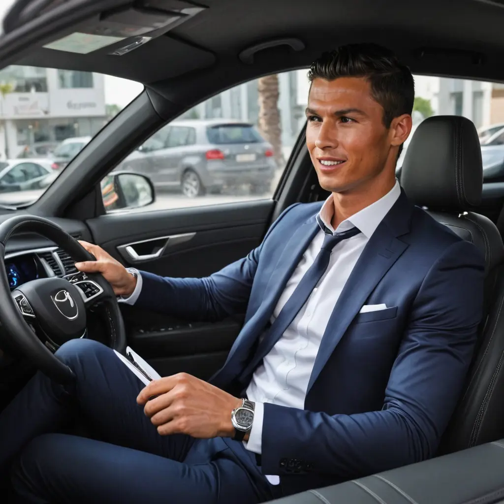 ارسم لي امبابي يسوق سيارة وكريستيانو يجلس في الكرسي الخلفي وكأنه مدير شركة
