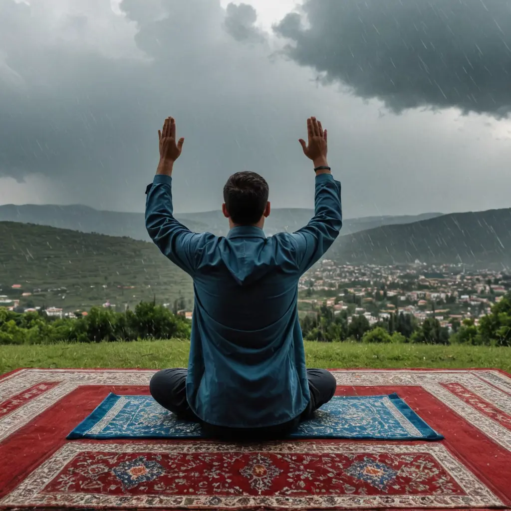 شخص علي سجادة الصلاة يدعو الله ويرفع يديه  والسماء تمطر