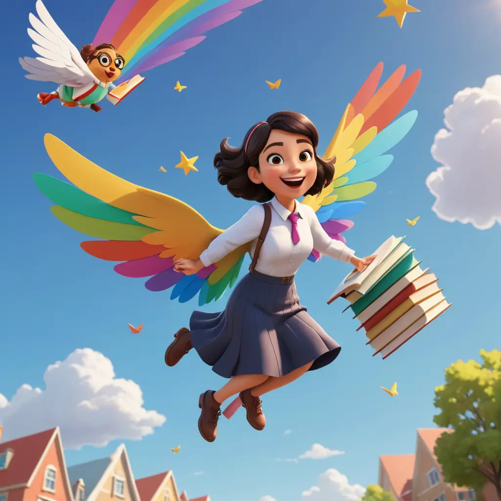 معلمة ذو شخصيه كارتونيه تطير باجنحه ملونه ومعها كتب تطير في السماء