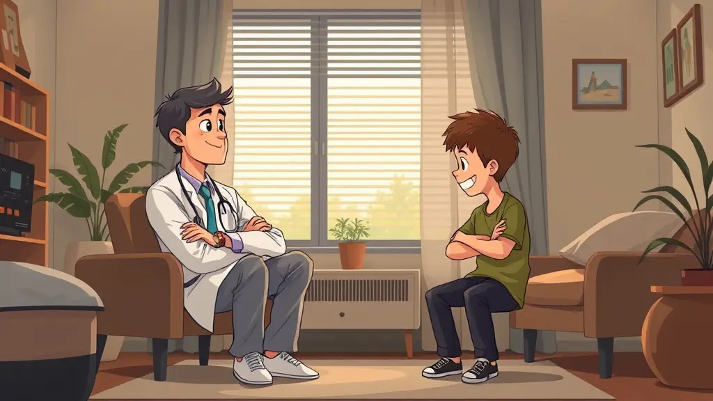 ابتكر صورة لطبيب أطفال أو معالج نفسي مريض يجلس مقابل صبي صغير عنيد في غرفة علاج مريحة. الصبي متقاطع الذراعين وينظر بعيدًا، بينما يحافظ طبيب الأطفال على سلوك هادئ ولطيف بابتسامة خفيفة، مستعدًا للتفاعل. يتميز المشهد بإضاءة خافتة ولوحة ألوان دافئة، مما يخلق بيئة مريحة. استخدم أسلوب الرسم الرقمي الواقعي لالتقاط التعبيرات التفصيلية ولغة الجسد. (فيديو) سلسلة من المشاهد تصور تفاعلات طبيب الأطفال والصبي العنيد في غرفة العلاج، تعرض لحظات مختلفة من التحدي والفهم. تتحرك الكاميرا ببطء في أرجاء الغرفة، مع التركيز على تعبيرات وحركات الشخصيتين، مع انتقالات سلسة بين اللقطات. استخدم أسلوبًا وثائقيًا لتعزيز الأصالة والعمق العاطفي.