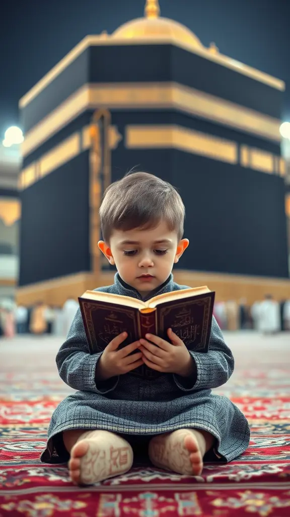 "طفل صغير جالس أمام الكعبة، ممسكًا بالقرآن بيديه. هو جالس على سجادة صلاة، يقرأ القرآن بتركيز وهدوء. الجو هادئ، مع إضاءة ناعمة تبرز الطفل والمحيط المقدس للكعبة."