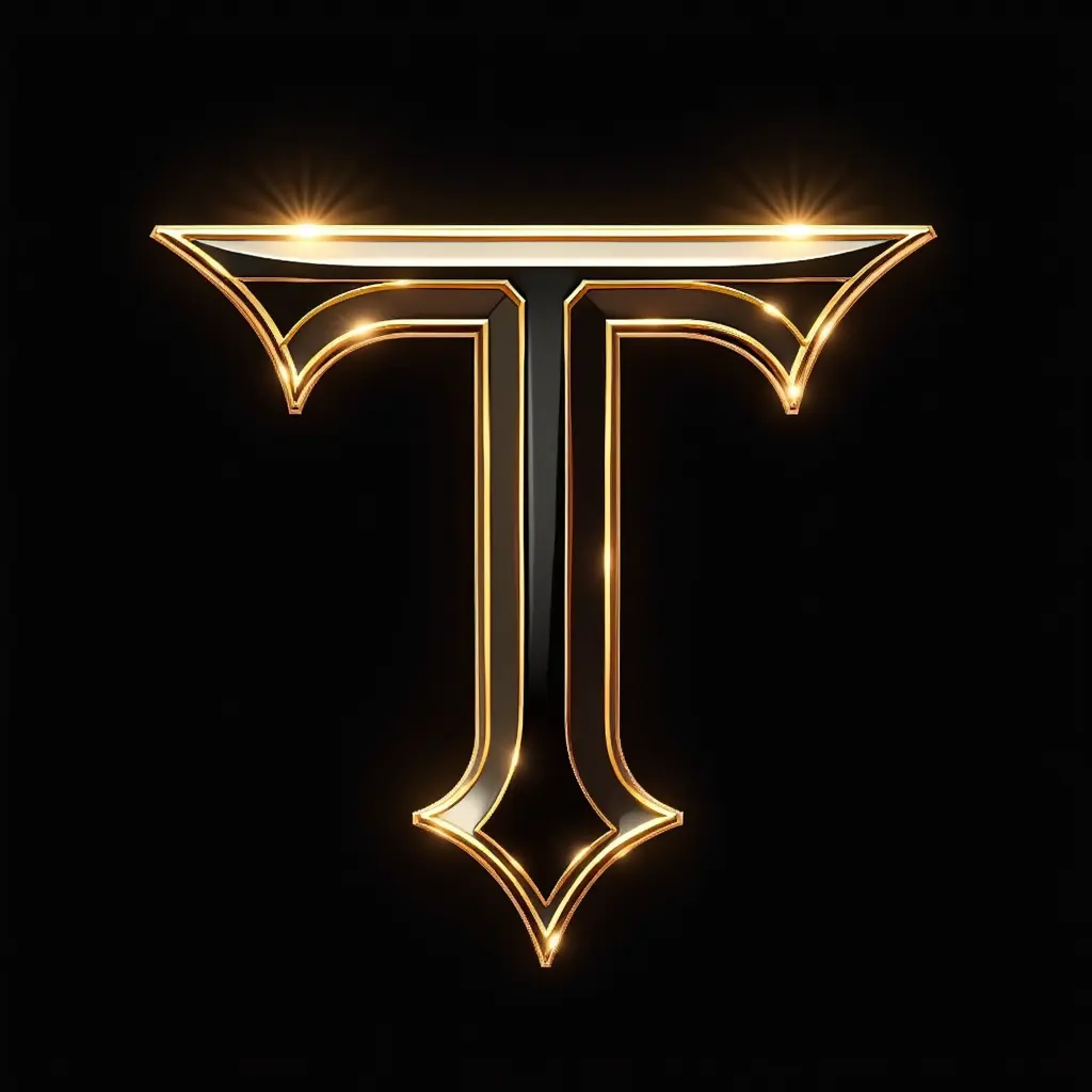 شعار ماركة أزياء بحرف T منمق، لامع، لامع، لامع، مصنوع بألوان الذهبي والأسود، حاد، عصري، فاخر، ذو طابع تكنولوجي