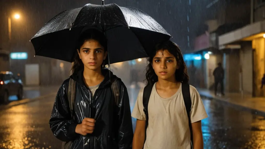 فتاة عراقيه عمرها 16 شعرها متوسط تقف وسط مطر مع مضله في الليل في شارع خالي مع فتى صغير عمره 15