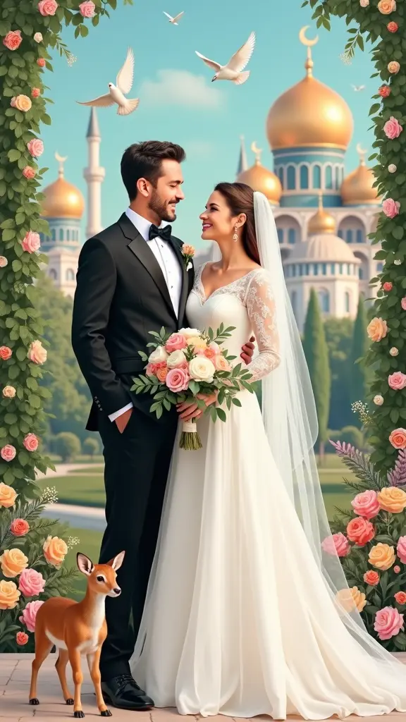 هذه الصورة تصور زوجين يرتديان ملابس زفاف أنيقة؛ العريس يرتدي بدلة رسمية سوداء، والعروس ترتدي فستان زفاف أبيض مع حجاب. تبدو السعادة ظاهرة على وجههما، وهما يتبادلان النظرات بابتسامة. الخلفية مليئة بعناصر جميلة مستوحاة من الطبيعة والهندسة الإسلامية، مع قباب ذهبية وزرقاء، أشجار، ورود ملونة، وطيور بيضاء (حمام) تطير في السماء. بالإضافة إلى ذلك، هناك غزال صغير يظهر بجانب العروس، ما يضفي لمسة لطيفة على المشهد.