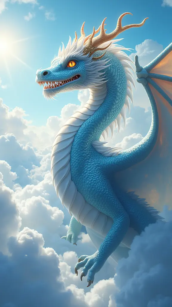 التنين السماوي: تنين ضخم بألوان متلألئة تجمع بين الأزرق الفاتح والفضي، يمتلك أجنحة شفافة تمتد عبر السماء وتلمع تحت أشعة الشمس. عيونه تتوهج بالحكمة القديمة، ويطير فوق بحر من الغيوم المتحركة، وعلى جسده نقوش ذهبية قديمة تعكس أسرارًا وقوى خارقة.
