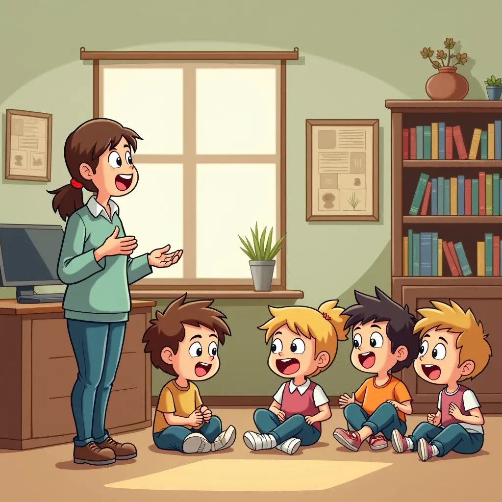 معلمة تتحدث الى الاطفال بشكل كرتون