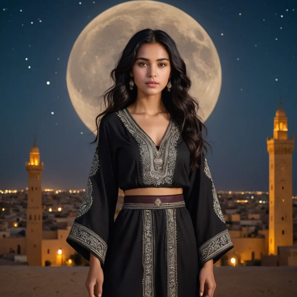 بنت شعرها اسود عيون بني غامق طولها 1.76 متر وزنها 83 كيلوغرام ترتدي زي مغربي تحت ضوء القمر والنجوم
