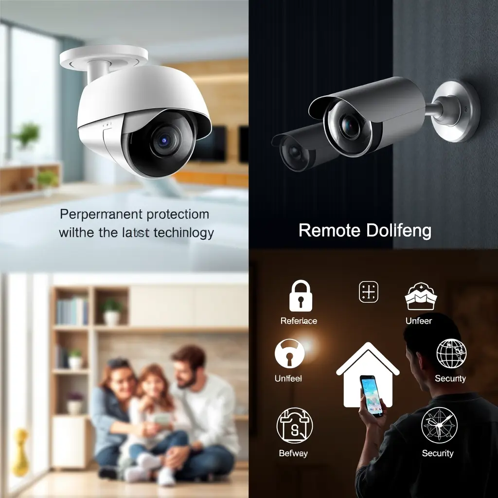 1. **صورة كاميرا مراقبة مع شعار الأمان**: صورة لكاميرا مراقبة حديثة مع خلفية تعبر عن الأمان، مثل منزل أو مؤسسة تجارية، مع إضافة نص مثل "حماية دائمة بأحدث التقنيات". 2. **عائلة آمنة**: صورة لعائلة سعيدة في منزلهم مع وجود كاميرا مراقبة في الخلفية، مع نص يعبر عن الحماية والراحة. 3. **مراقبة عن بُعد**: صورة لشخص يتابع كاميرات المراقبة عبر هاتفه المحمول مع خلفية تعبر عن الابتكار والتكنولوجيا. 4. **مقارنة قبل وبعد**: صورة مقسمة إلى قسمين: جانب يعبر عن مكان غير آمن، والآخر يعبر عن نفس المكان مع كاميرات مراقبة وأجواء آمنة. 5. **رمزيات الأمان**: صورة رمزية تجمع بين أيقونات مثل الكاميرا، القفل، المنزل، والعائلة، مع ألوان هادئة تعبر عن الثقة والأمان.