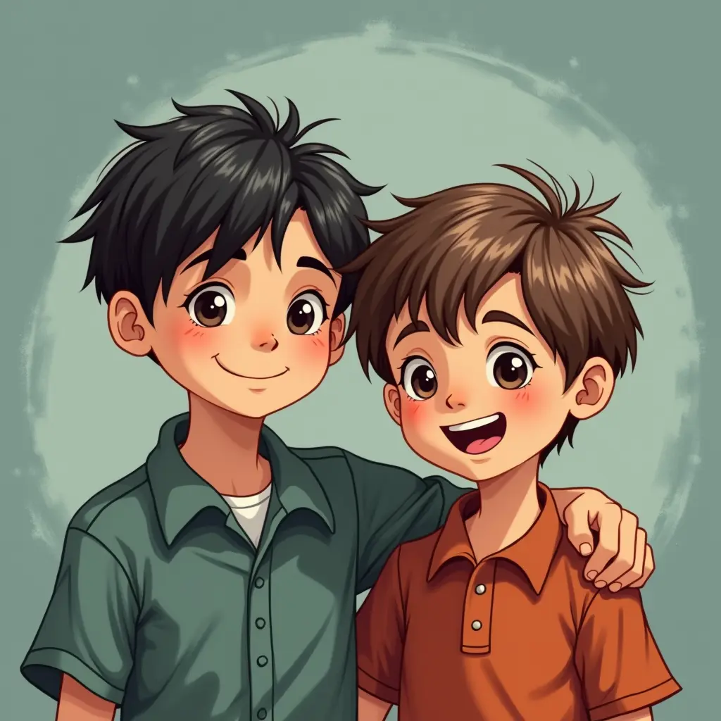 انشئ صوره ولدين ولد عنده 13 سنه والاخر عنده 8 سنين الصغير لون شعره اسود وطويل نوعا ما اللي عنده 13 سنه شعر طبيعي ولو انه اسود واملس ولابس تيشرت عليه "RAYAN" واللي عنده ثمان سنين التيشرت عليه "YAMEN" والاثنين يلبسوا نضاره