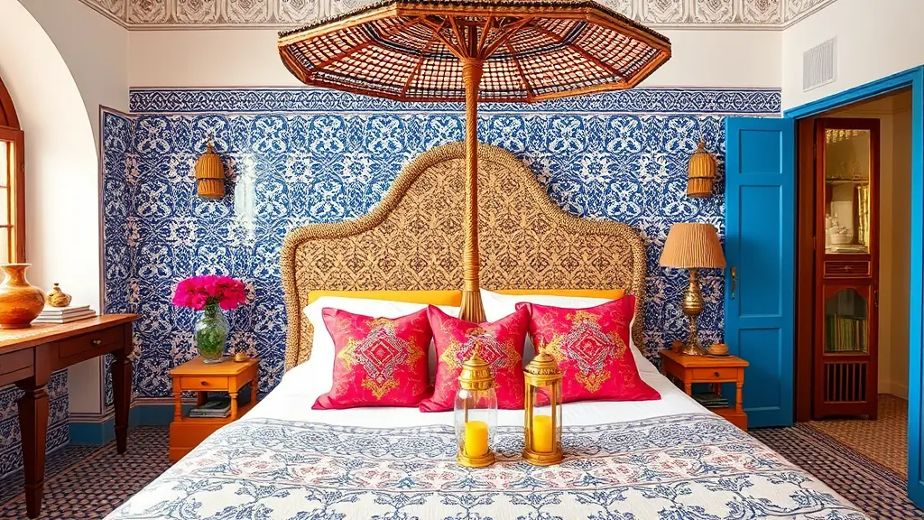 غرفة نوم مغربية ملونة، فيها بلاط تقليدي أزرق وأبيض، مخدات حرير ملونة زاهية، سرير مع مظلة خشبية منقوشة، وفوانيس زجاج ذهبية معلقة