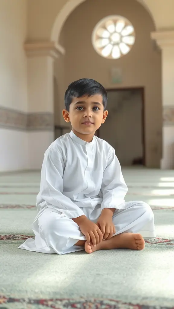 1. طفل صغير يرتدي جلبابًا أبيض جالس على الأرض داخل مسجد بسيط، ينظر بثقة.
