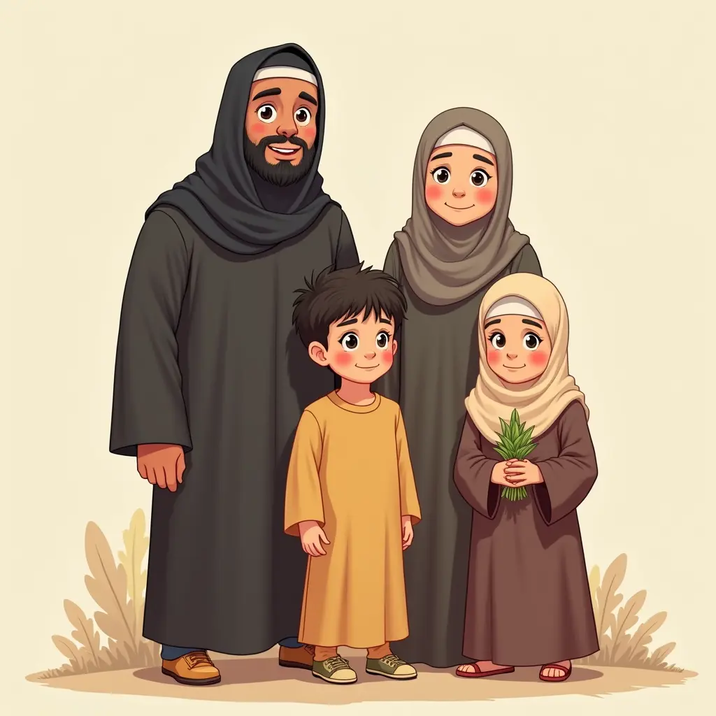صورة إنمي لعائلة مسلمة مكونة من أب و ام محجبة حنطية البشرة مع طفل بعمر 10سنوات وطفلة بعمر 6 سنوات وطفلة بعمر 7سنوات