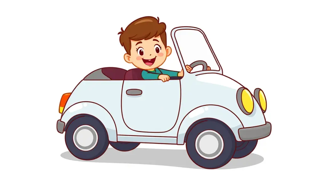 صورة كرتونية لسيارة  مرحة  يركب بها طفل  خلفية بيضاء