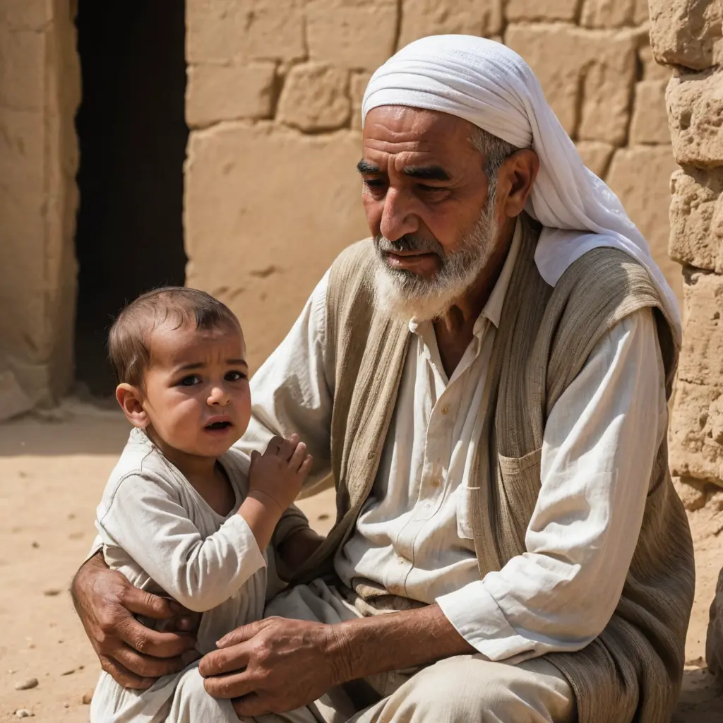 رجل عربي مصري كبير في السن ويظهر عليه الوهن ومعهو طفل صغير ويبكي وهو حزين