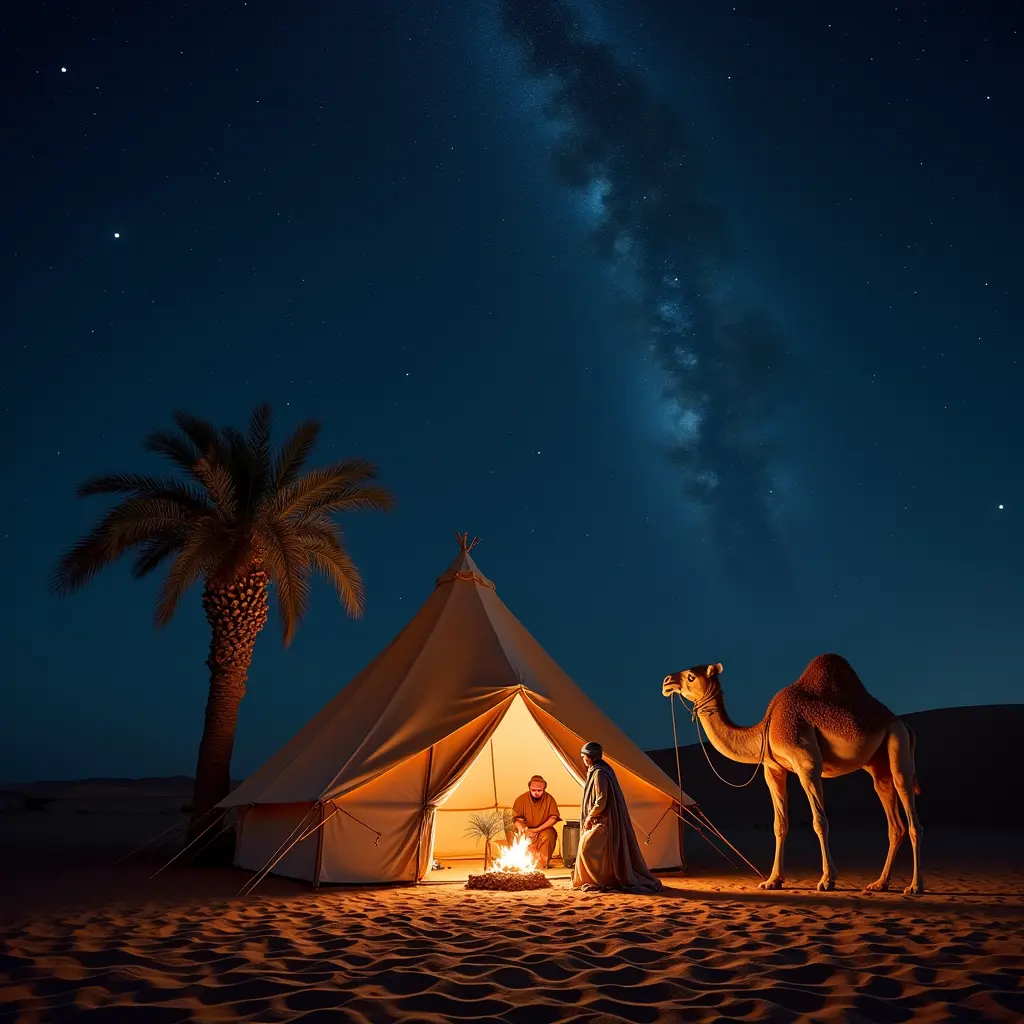 خيمة مصنوعة من وبر الجمال الرحل البدو بجانبها جمل و نخلة  و في ذاخل للخيمة امرأة بدوية ورجل بدوي يطهو الطعام فوق النار الخيمة توجد في وسط الصحراء وقت اليل والسماء مقمرة  و نرى أيضا نجوم درب التبانة في السماء