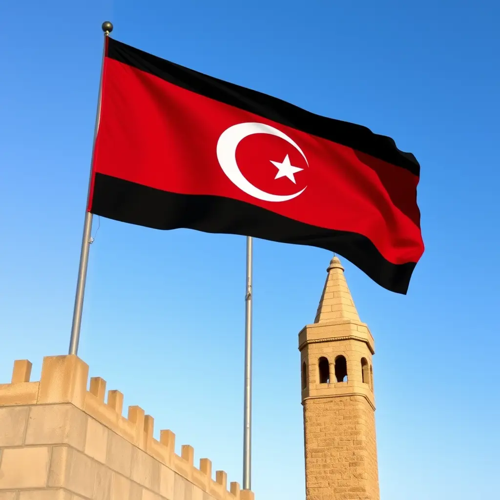 علم دولة( ليبيا) مكون الالوان احمر اسود اخضر في الوسط هلال ونجمة /علي سارية طويلة اعلى برج