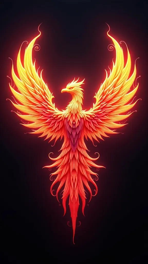 صورة 15cm x 20cm شعار طائر الفينيق، يتصاعد من النيران الرقمية، مستقبلي، تفصيلي، ألوان نيون، ثلاثي الأبعاد