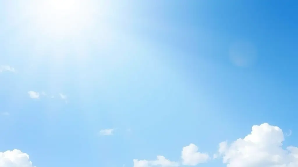 "سماء صافية زرقاء مع سحب بيضاء خفيفة، الإضاءة مشرقة وهادئة، أجواء روحانية تبعث الأمل."