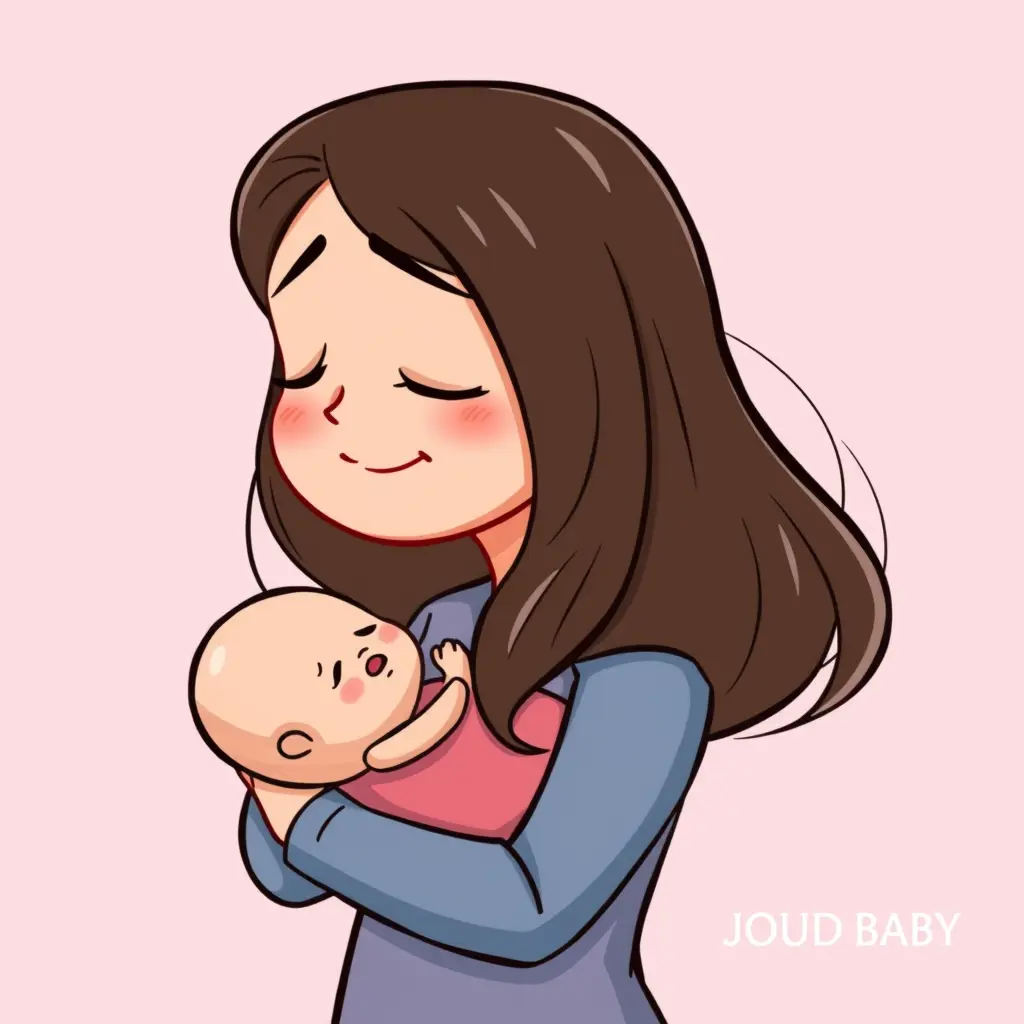 صورة كرتونية  أم تحمل طفلها بابتسامة مرهقة لكن دافئة، مع خلفية ناعمة مثل اللون الوردي الفاتح أو الأزرق السماوي.  مع شعار الصفحة JOUD BABY  بشكل واضح.
