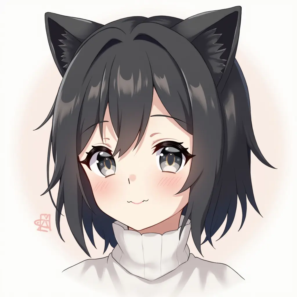 فتاه انمي وجهها جميل عيناها رماديه ترتدي بلوزه بيضاء برقبه وشعرها اسود واذان القطه سوداء تبتسم بلطف