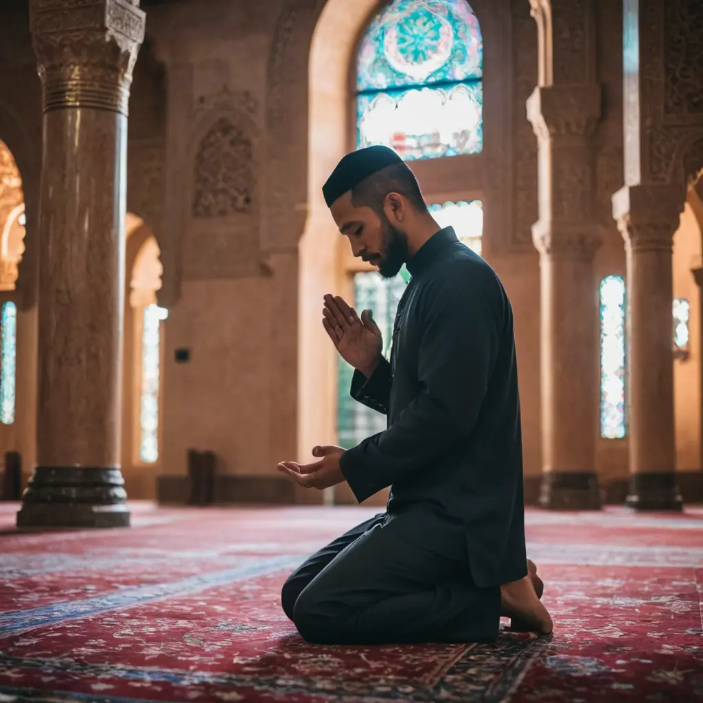 صورة لرجل يصلي بالمسجد وهو خاشع يدعو الله