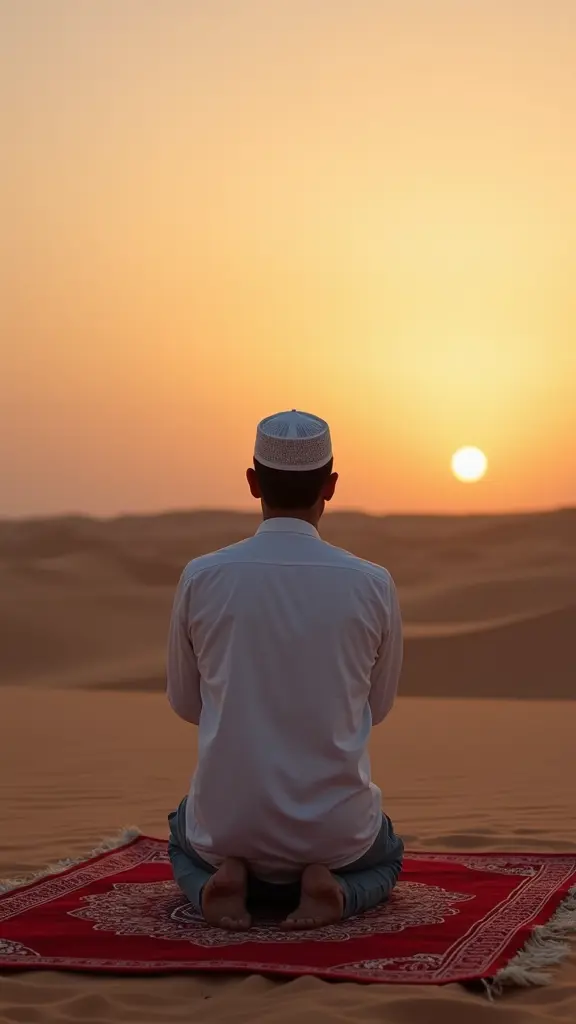 رجل مسلم عربي يسجل على سجادة اتجاة القبلة في الصحراء والمنضر الغروب في وضعية السجود
