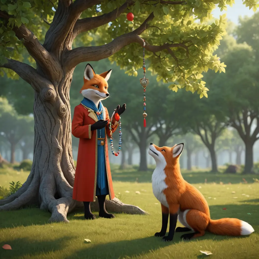 صورة 3d لثعلب يرتدي زي العابدين وفي يده سبحة يقف تحت شجرة ينظر لٲعلي حيث وفوق الشجرة يقف ديك جميل الشكل والالوان.