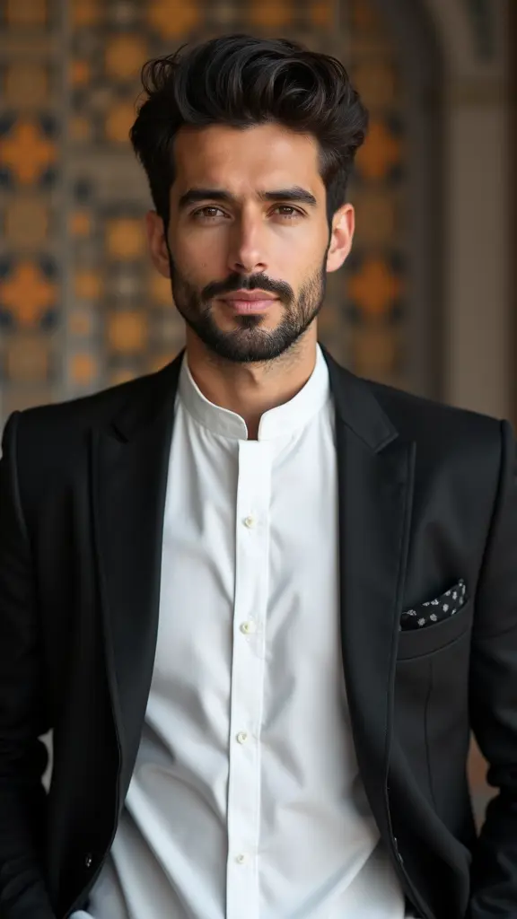 رجل لابس قميص إسلامي أبيض مع جاكيت كلاسيكية سوداء