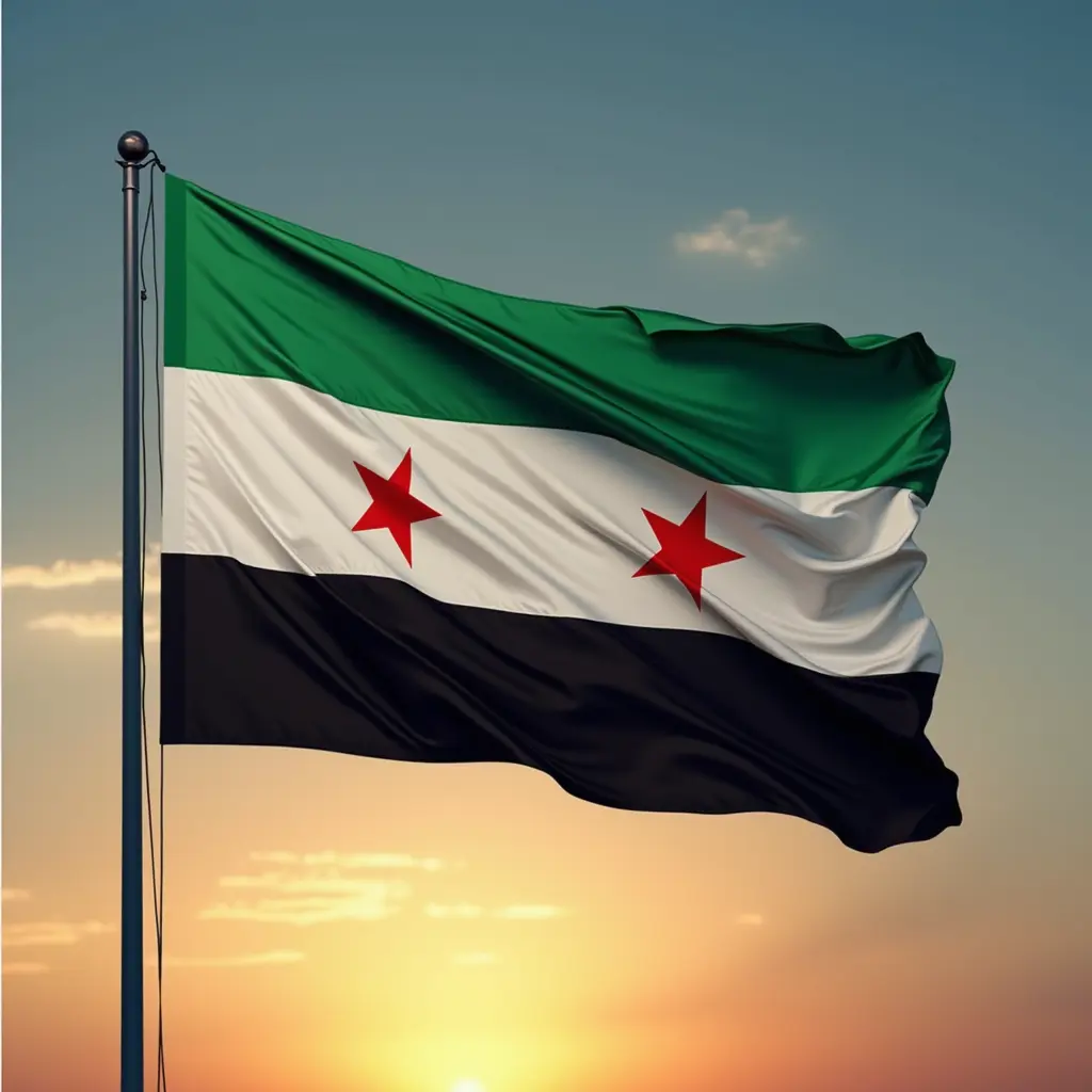 علم سوريا الحرة علم يتكون من ثلاثة أشرطة أفقية: الشريط العلوي أخضر، الشريط الأوسط أبيض يحمل ثلاث نجوم حمراء، والشريط السفلي أسود.العلم يرفرف عالياً في السماء مع خلفية غروب الشمس التي تضفي جواً من الشاعرية والمشاعر الوطنية. تظهر السماء متدرجة الألوان بين الأزرق والبرتقالي، ، مما يضيف لمسة رمزية تعكس الأمل والتحدي.