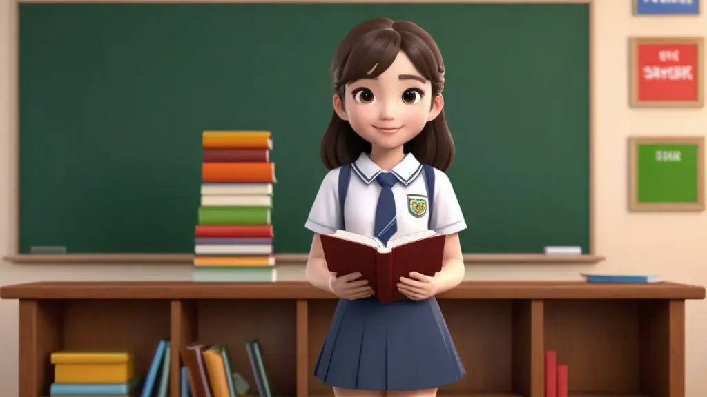 بنت شخصية كرتونية ثري دي ، يرتدي زى مدرسة ، تحصل على كتاب مدرسة مجانا