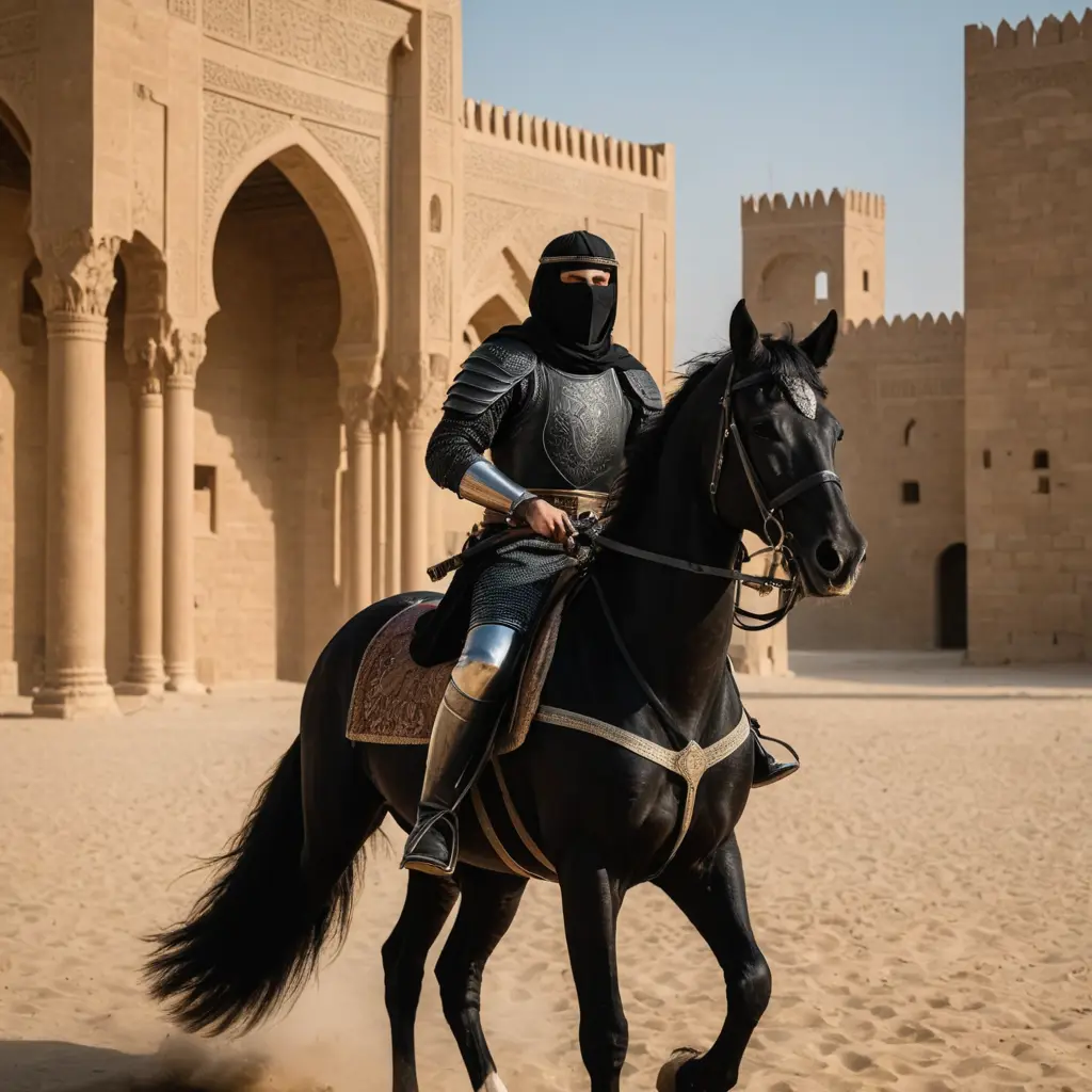 فارس عربي ملثم يحمل سيف ويمتطي حصان أسود