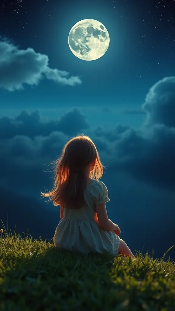 فتاه تتطلع الي القمر ف السماء وتجلس علي ارض خضراء