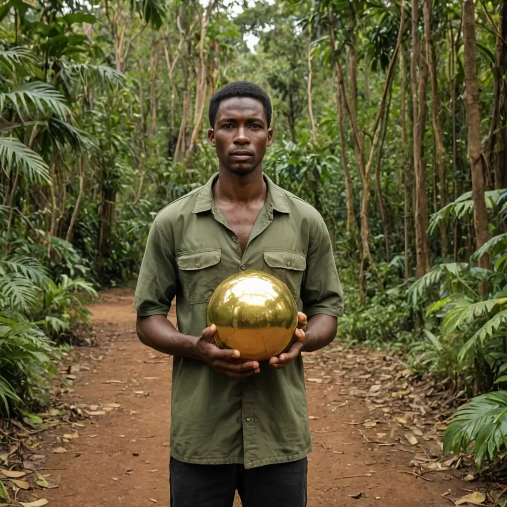 رجل يقف في وسط أدغال افريقيا ويحمل كرة ذهبية