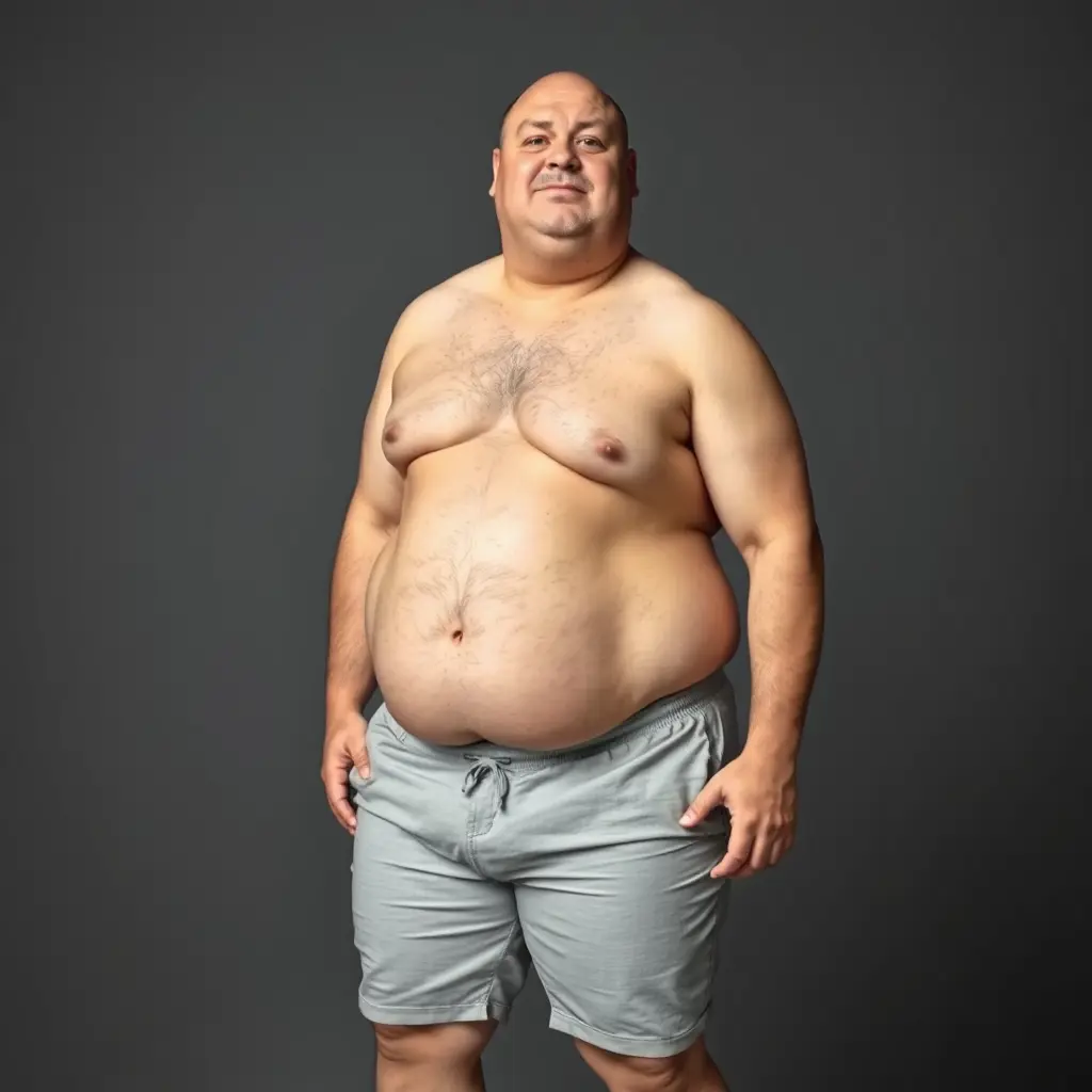رجل سمين، ولكن ليس سمينًا جدًا، يرتدي شورتًا ضيقًا جدًا ويظهر جسده
