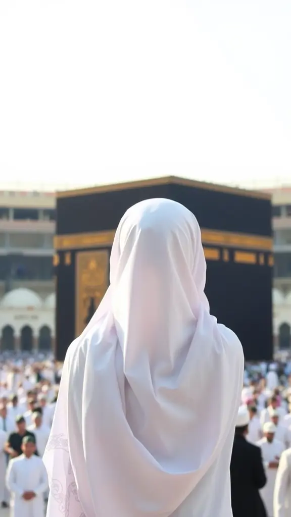 أنشأ صورة سيدة ترتدي الحجاب الابيض والجلباب الابيض وتصلي أمام الكعبة المشرفة في الحرم المكي