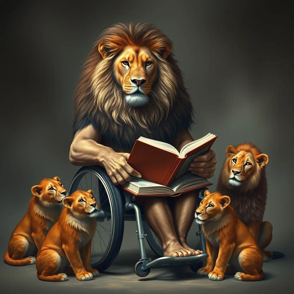 صوره اسد بجسم ختيار انسان على كرسي متحرك و لاسد عم يقرا كتاب و حوالي الاسد ٣ اسود