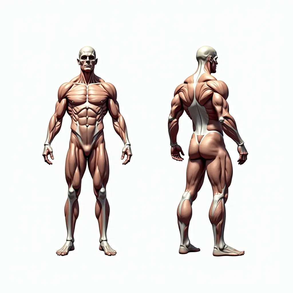 رسم هندسي للتشريح العضلي للجسم كامل للاعب قوي وراس جمجمه صوره من الامام وصوره من الخلف، خلفيه بيضاء