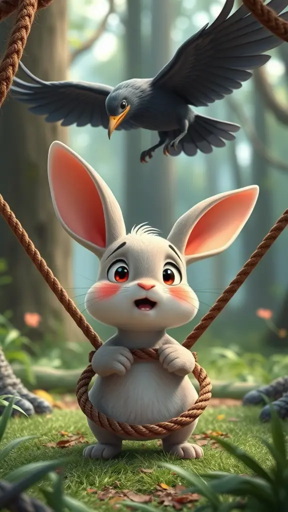 "أرنب كرتوني صغير عالق في مصيده من الحبال داخل الغابة، يظهر الغراب العجوز وهو يحلق فوقه ويشجعه، تعبير وجه الأرنب فيه خوف لكن فيه أمل، الألوان زاهية مع جو من الترقب، الأسلوب كرتوني ثلاثي الأبعاد للأطفال."