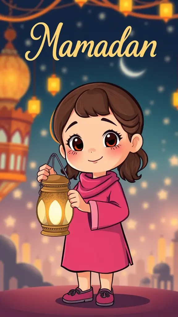 شخصيه كرتونيه لفتاه صغيره تحمل فانوس رمضان وخلفها اجواء رمضانيه ويحب ظهور اسم الفتاه في الخلفيه بخط جميل اسمها منى