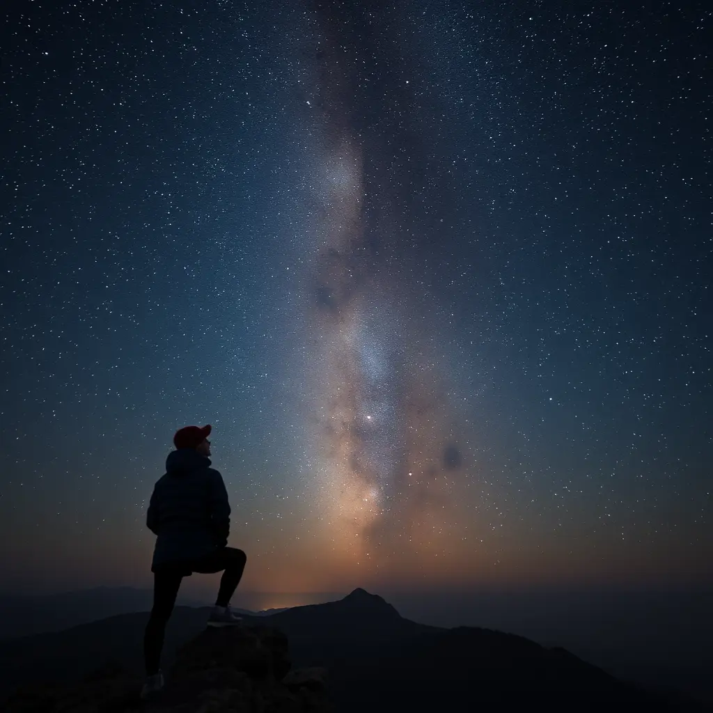 صورة شخص في جبل ينظر للنجوم الجميلة اللامعة