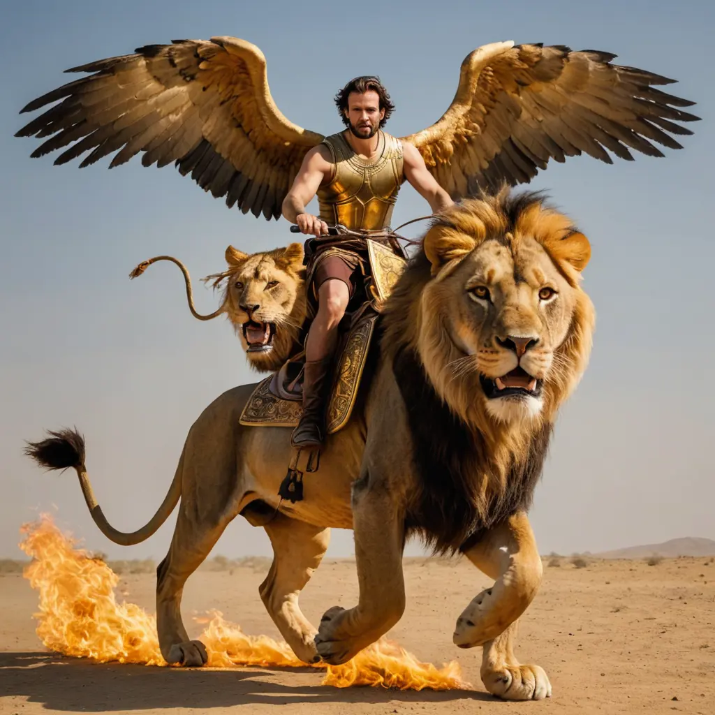 رجل يركب أسد والاسد له أجنحة ذهبية مشتعلة