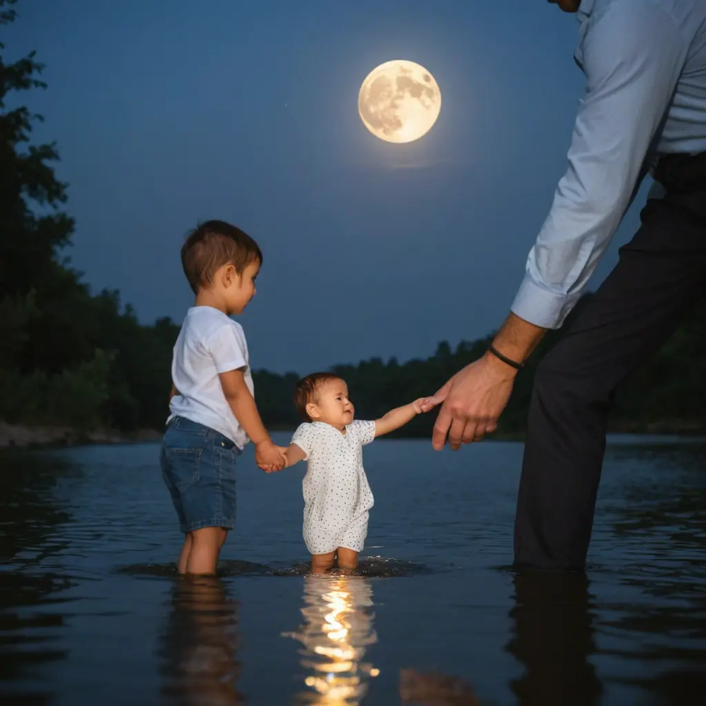 تمسك بيد طفله صغير علي النهر مع القمر والأب يمسك بيد الأم