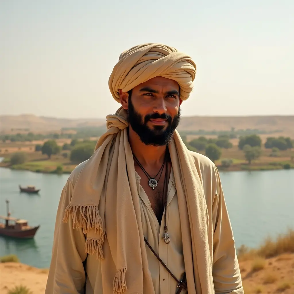 رجل مصري قمحي اللون ٣٥ عام يرتدي جلابية فلاحية وعمامة بخلفية نهر نيل وارض زراعية وقوارب نهرية