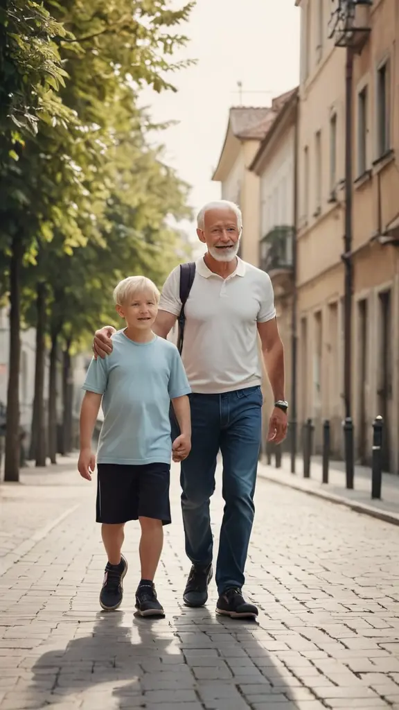 صوره لرجل عجوز يمشي مع شخصين الأول طفل صغير والثاني رجل صاحب جسم رياضي وعضلات أسلوب الانيميشن
