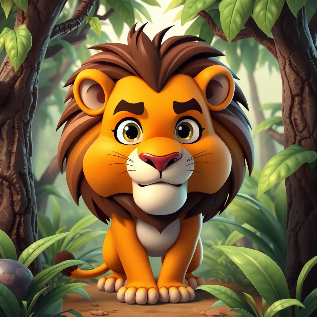 أسد قوي كرتون في غابة ثلاثي الأبعاد