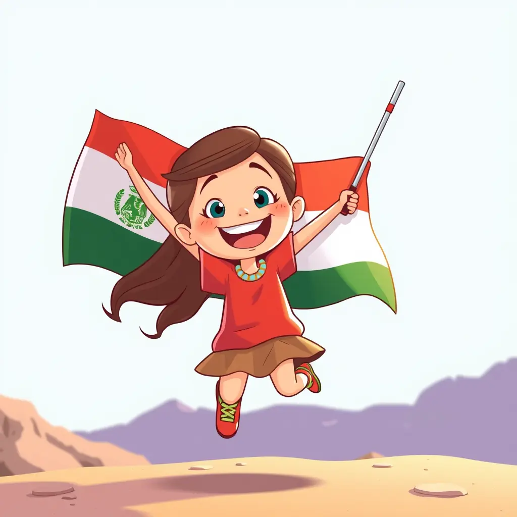 طفلة برسم كارتوني تبتسم وهي تحمل علم مصر وتقفز في الهواء
