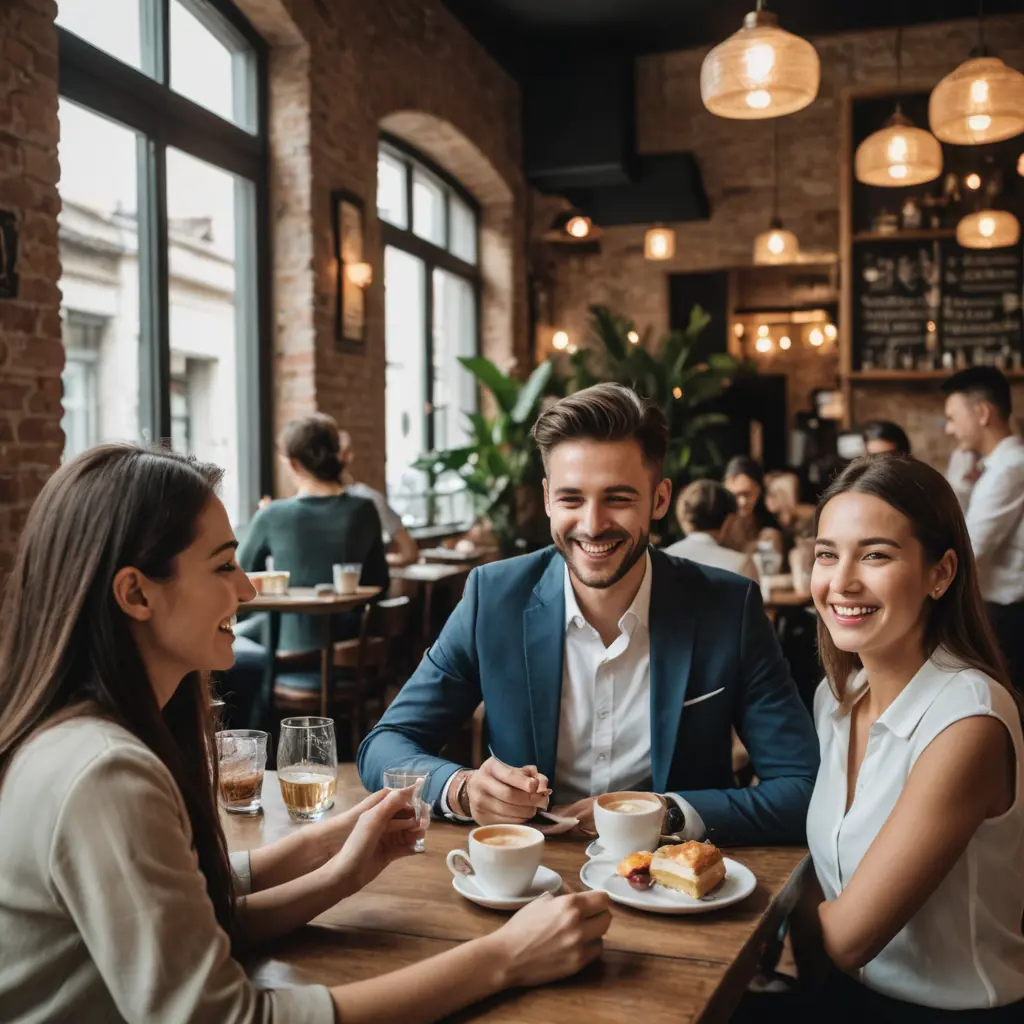 صوره لزبائن سعداء في مقهى سبب السعاده هي خدمه النادل ومعاملته الراقيه